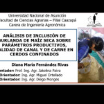 Diana María Fernández Rivas, estudiante de Ing. Agronómica en la Facultad de Ciencias Agrarias (FCA/UNA), Filial Caazapá y, beneficiaria del Programa Universitario de Becas para la Investigación, “Andrés Borgognon Montero» (PUBIABM), 2021, culminó con éxito su investigación, titulada: “Análisis de inclusión de burlanda de maíz seca sobre parámetros productivos, calidad de canal y de carne en cerdos confinados”, como parte del requisito académico para la obtención del Titulo de Grado. La defensa de Tesis se realizó en fecha 09 de diciembre, de manera virtual. Cabe mencionar que, el trabajo estuvo bajo la tutoría de la Prof. Ing. Jakelina Paiva de Acosta.