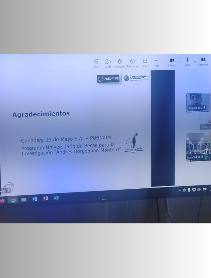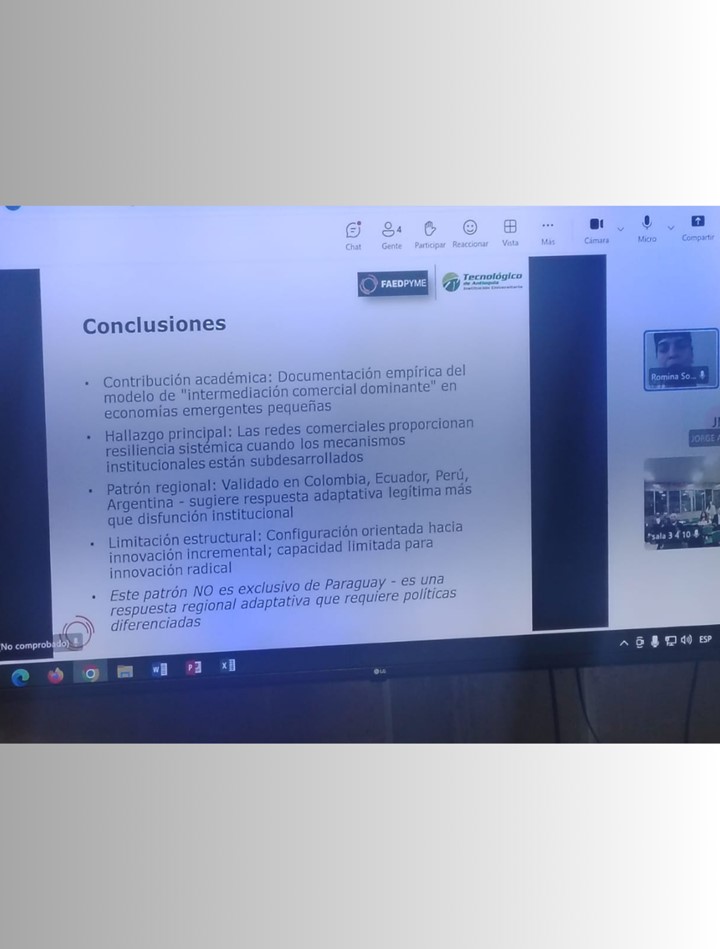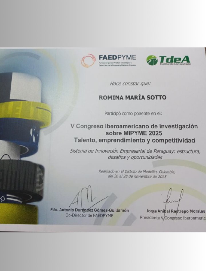 La becaria del Programa Universitario de Becas para la Investigación “Andrés Borgognon Montero” (PUBIABM), Lic. Romina Sotto, estudiante de la Maestría en Ingeniería de Producción (FACEN/UNA), participó en el V Congreso Iberoamericano de Investigación sobre MIPYME 2025, bajo el lema “Talento, emprendimiento y competitividad”, realizado en el Tecnológico de Antioquia (TdeA), en Medellín, Colombia.